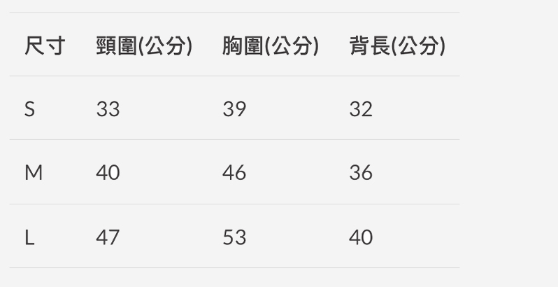 頸圍胸圍身長體重尺寸建議